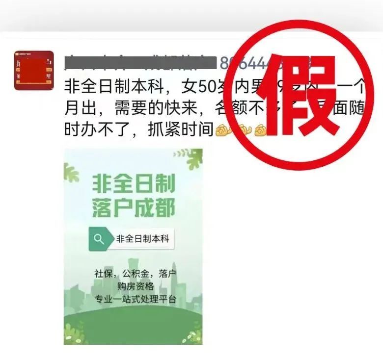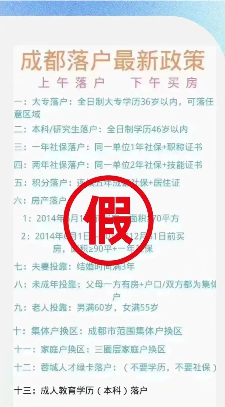 近期,网上一则关于“成都落户最新政策”?的图文信息在网络平台传播,内容称“非全日制本科也可以落户成都了、函授本科、成人教育、自考本科、网络教育全部可以落户成都,有房落房,无房落集体户”,?相关信息引发关注和讨论,部分网民误以为成都又出新政,非全日制本科可通过学历落户成都。