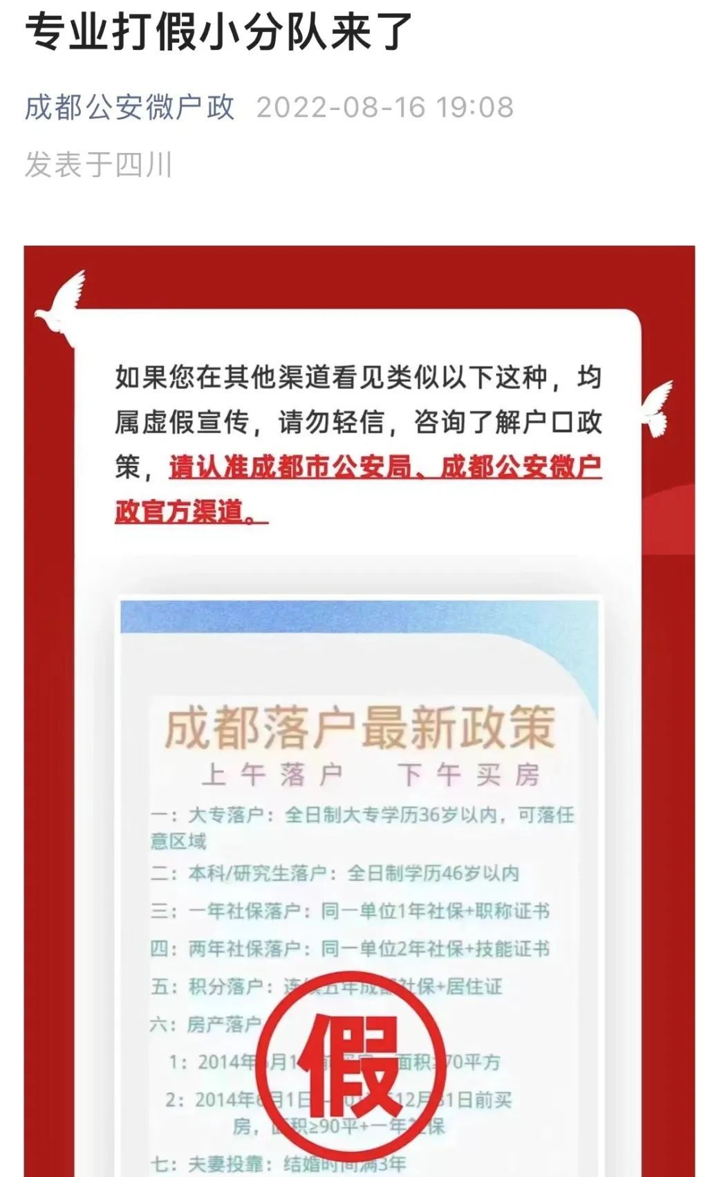 对此,8月16日“成都公安微户政”官微发布信息表示,此类信息均属虚假宣传,?请勿轻信。咨询了解户口政策,请认准成都市公安局、成都公安微户政官方渠道。